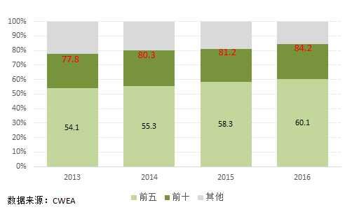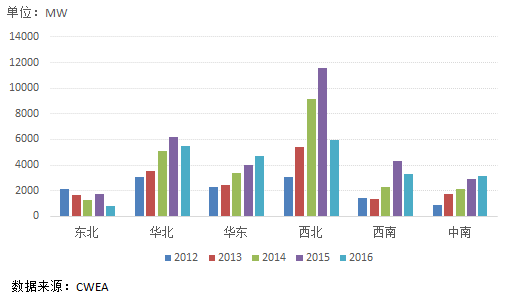圖1 2006年至2016年中國新增和累計風電裝機容量 區域裝機情況 2016年,我國六大區域的風電新增裝機容量所占比例分別為西北地區(26%)、華北(24%)、華東(20%)、西南(14%)、中南(13%)、東北(3%)。 與2015年相比,2016年我國華北地區和華東地區以及中南地區占比均出現了增長,其中華東地區占比由13%增長到20%,中南地區占比由9%增長到13%;西北地區和東北地區均出現減少,其中西北地區占比由38%下降到26%;西南地區占比維持不變。 圖2 2015年和2016年中國各區域新增風電裝機容量占比情況 圖3 2012年至2016年中國各區域新增風電裝機容量趨勢 1、東北地區(包括遼寧、吉林、黑龍江); 2、華北地區(包括北京、天津、河北、山西、內蒙古); 3、華東地區(包括山東、江蘇、安徽、上海、浙江、江西、福建); 4、西北地區(包括新疆、甘肅、青海、寧夏、陜西); 5、西南地區(包括四川、重慶、云南、貴州、西藏); 6、中南地區(包括河南、湖北、湖南、廣東、廣西、海南)。 圖4 2016年中國各省(區、市)新增風電裝機容量 圖5 2016年中國各省(區、市)累計風電裝機容量 風電機組制造商裝機情況 2016年,中國風電有新增裝機的整機制造商共25家,新增裝機容量2337萬千瓦,其中,金風科技新增裝機容量達到634.3萬千瓦,市場份額達到27.1%。金風科技仍遙遙領先,位列第1。遠景能源、明陽風電、聯合動力和重慶海裝分列2至5名。 圖6 2016年中國風電整機制造企業新增裝機容量 表1 2016年中國風電整機制造企業新增裝機容量 數據來源:CWEA 圖7 2016年中國風電整機制造企業國內市場份額 近4年,風電整機制造企業的市場份額逐漸趨于集中。排名前五的風電機組制造企業市場份額由2013年的54.1%增加到2016年的60.1%,排名前十的風電制造企業市場份額由2013年的77.8%增長到2016年的84.2%。 圖8 2013年至2016年中國風電整機制造企業國內市場集中度變化情況 全國累計裝機容量1.69億千瓦,截至2016年底,有五家整機制造企業的累計裝機容量超過1000萬千瓦,五家市場份額合計達到55.9%;其中金風科技累計裝機容量達到3748萬千瓦,占國內市場的22.2%。 圖9 2016年中國風電制造企業累計裝機容量 圖10 2016年中國風電制造企業累計市場份額 風電機組機型統計 2016年,我國新增裝機的風電機組平均功率1955kW,與2015年的1768kW相比,增長6.4%;累計裝機的風電機組平均功率為1608kW,同比增長2.9%。 圖11 1991年至2016年中國新增和累計裝機的風電機組平均功率 2016年,我國新增風電機組中,2MW風電機組裝機占全國新增裝機容量的60.9%,與2015年相比,2MW機組所占市場份額上升11個百分點;1.5MW機組市場份額下降了16個百分點至17.8%;1.5MW機組和2.0MW機組合計市場份額達到78.7%。2.1MW至2.9MW機組市場份額達到15.2%,3MW至3.9MW機組(3MW和3.6MW)市場份額達到2.6%,4MW及以上機組(包括4MW、4.2MW、5MW)占比達到1.9%。 圖12 2016年中國不同功率風電機組新增裝機容量比例 2016年,我國累計風電裝機中,1.5MW的風電機組仍占主導地位,占總裝機容量的50.4%,同比下降約5個百分點;2MW的風電機組市場份額上升至32.2%,同比上升約5個百分點。 圖13 2016年中國不同功率風電機組累計裝機容量比例 圖14 2006年至2016年1.5MW和2.0MW機組新增裝機容量 風電開發商裝機情況 2016年,中國風電有新增裝機的開發商企業超過100家,前十家裝機容量超過1300萬千瓦,占比達到58.8%。累計裝機前十家的開發企業裝機容量超過1億千瓦,占比達到69.4%。 圖15 2016年中國風電開發企業新增裝機容量 圖16 2016年中國風電開發企業新增裝機市場份額 圖17 2016年中國風電開發企業累計裝機容量 圖18 2016年中國風電開發企業累計裝機市場份額 注:國電集團的統計為龍源、國電電力及其他分公司的數據之和 華能集團的統計為華能新能源和其他分公司數據之和 華電集團的統計為華電國際、華電新能源及其他分公司數據之和 華潤集團的統計為華潤電力和華潤新能源的數據之和 天潤的統計為天潤和天源的數據之和 三峽集團的統計為三峽和長江新能源的數據之和 中國電建統計為中水電、中水顧問和中水建數據之和 海上風電裝機情況 2016年,中國海上風電新增裝機154臺,容量達到59萬千瓦,同比增長64%。共有4家制造企業有新增吊裝,其中,上海電氣的海上風電機組供應量最大,占比達到82.5%;其次是遠景能源、金風科技和重慶海裝。 圖19 2016年中國海上風電新增和累計裝機容量 表2 2016年中國海上風電制造商新增裝機容量 截至2016年底,海上風電機組供應商共10家,其中,累計裝機容量達到15萬千瓦以上的機組制造商有上海電氣、遠景能源、華銳風電、金風科技,這4家企業海上風電機組裝機量占海上風電裝機總量的90.1%,上海電氣以58.3%的占比拔得海上風電機組供應量頭籌。 圖20 2016年中國海上風電制造商累計裝機容量 截至2016年底,在所有吊裝的海上風電機組中,單機容量為4MW機組最多,累計裝機容量達到74萬千瓦,占海上裝機容量的45.5%,其次是3MW裝機容量占比為14%。 圖21 2016年中國海上風電不同功率機組累計裝機容量 |